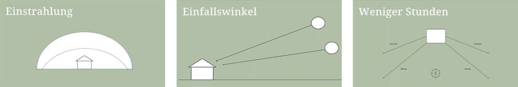 Im Winter sind die Tage deutlich kürzer, was selbst bei klarem Himmel die Anzahl der Stunden mit direkter Sonneneinstrahlung stark verkürzt. Ebenso tragen die winterlichen Wetterbedingungen – mehr Bewölkung, Nebel und Schnee – zur schwächeren Sonnenstrahlung bei.