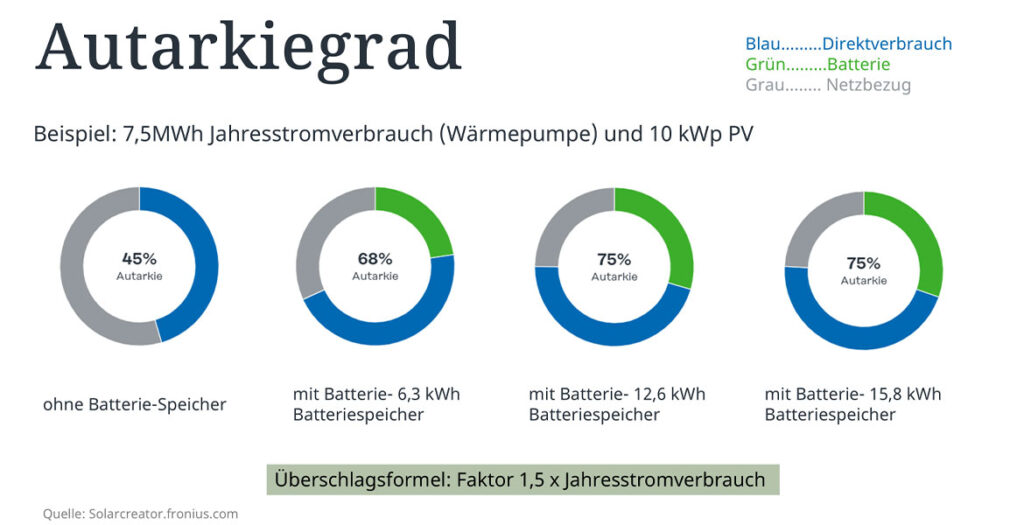 Wie die Grafik veranschaulicht, ist beim 12,6-kWh-Speicher bereits der maximale Autarkiegrad erreicht. Die Berechnungen stammen aus dem Fronius Solar.creator, einem Konfigurationstool für PV-Anlagen.