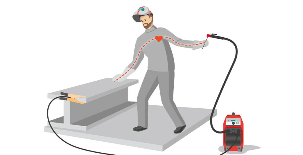 Nur ein kurzer Moment der Unachtsamkeit kann gravierende Folgen haben. Denn während bei handelsüblichen Elektrogeräten die stromführenden Komponenten isoliert sind, besteht beim Schweißen naturgemäß das Risiko, leitende Teile zu berühren. Das kann schnell aus einer reflexartigen oder anderweitig unbeabsichtigten Bewegung geschehen. Wenn das passiert, kommt es zur Berührungsspannung – zu einer „Durchströmung“ des Körpers. Das bedeutet, der Strom sucht sich den kürzesten Weg zwischen Eintritts- und Austrittsstelle. Im schlimmsten Fall kann das lebenswichtige Organe betreffen.