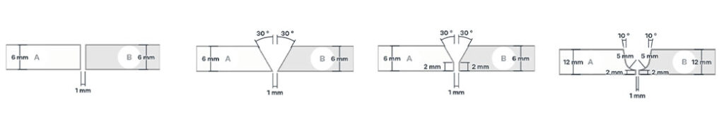 Grundsätzlich unterscheiden wir zwischen einseitigen und beidseitigen Nähten. Zu den einseitigen Nähten gehören die I-Naht, die V-Naht, die Y-Naht und die U-Naht. Werden diese halbseitig angearbeitet, nennt man sie HV-Naht, HY-Naht und HU-Naht. Wenn wir von der Ober- und Unterseite schweißen, erhalten die Nähte den Zusatz „D“ für „Doppel“ (zum Beispiel DV oder DHV).